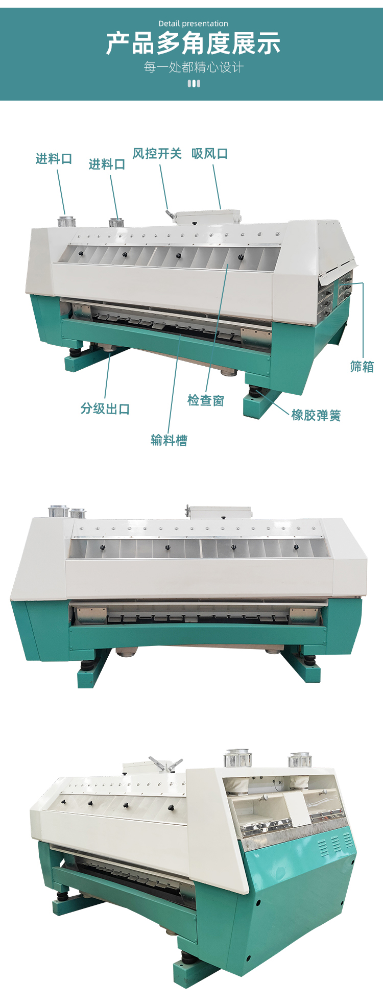 4、吸風(fēng)系統(tǒng)設(shè)計(jì)先進(jìn),風(fēng)道內(nèi)積存粉塵少,不堵塞,風(fēng)選效果好;